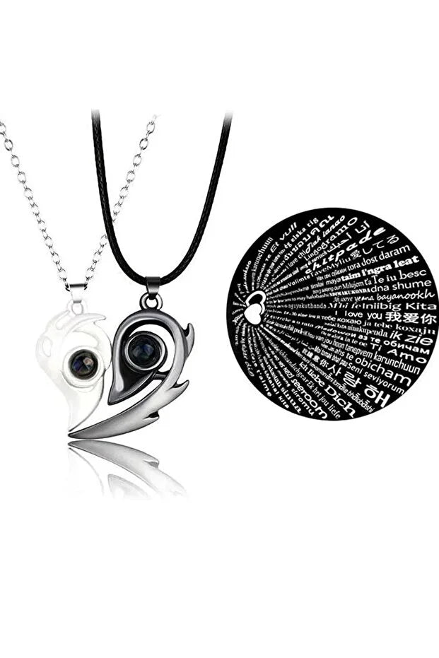 100 Dilde Seni Seviyorum Mercekli Kalpli Sevgili Çift Kolyesi